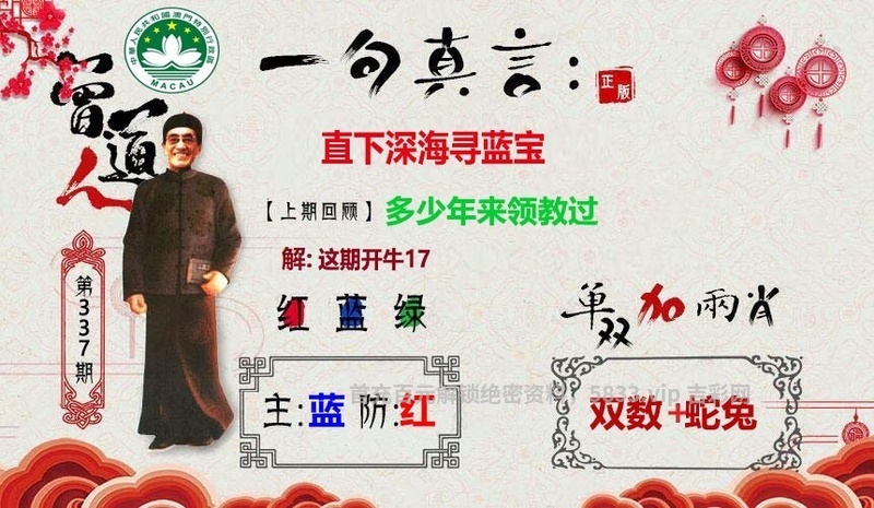 337期【解一句真言】:直下深海寻蓝宝,直下深海,解下肖鼠牛猪羊狗虎 王牌看好波色:蓝波+红波 |